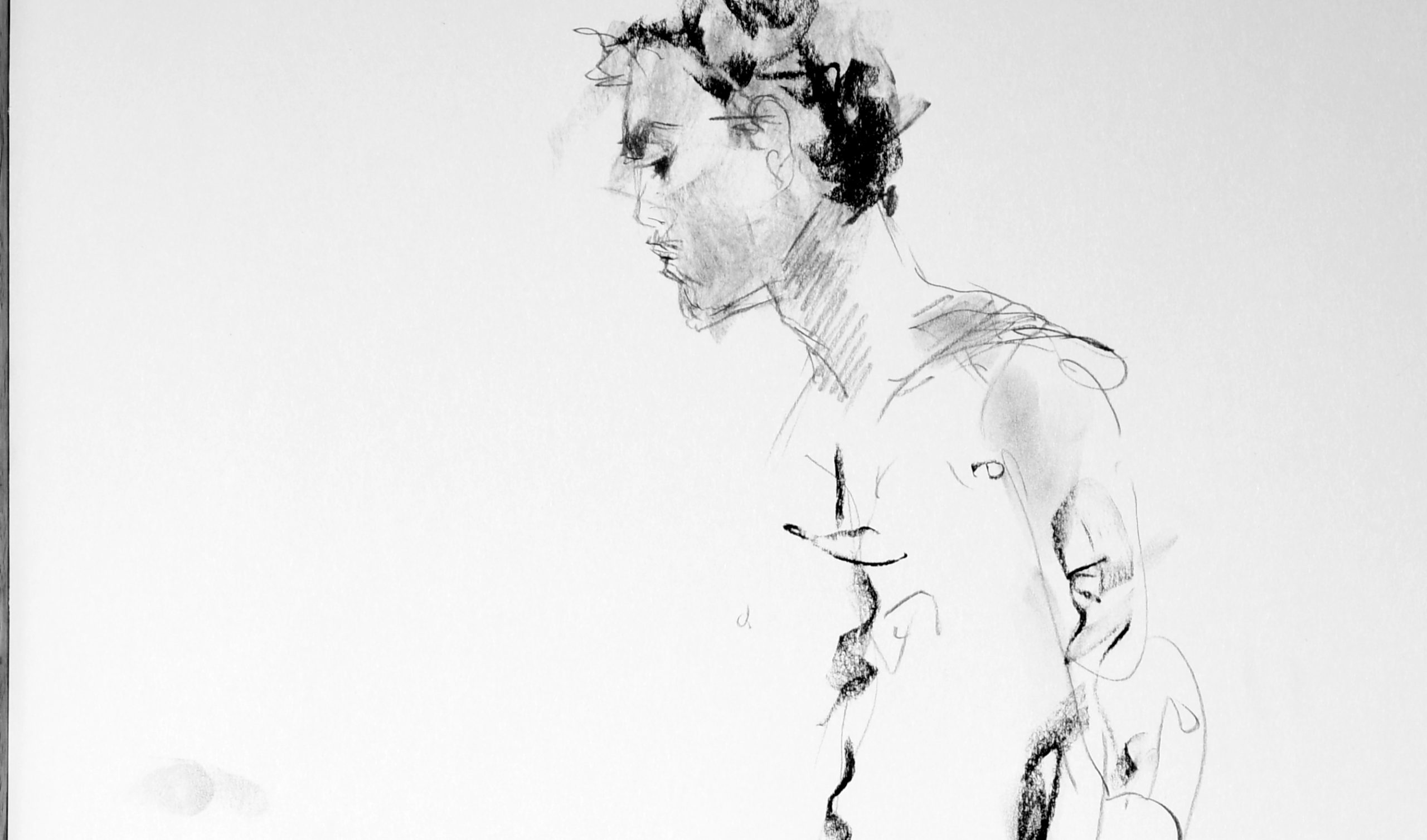 En mann! Tøft å holde denne stillingen! Et fantastisk ansikt, og etter så mange kvinneansikter, rotet jeg fælt. Det er noe med avstander og vinkler. Proporsjoner, sa De? Nei, gi Dem, da, De!Kveldens første tegning.