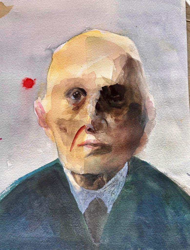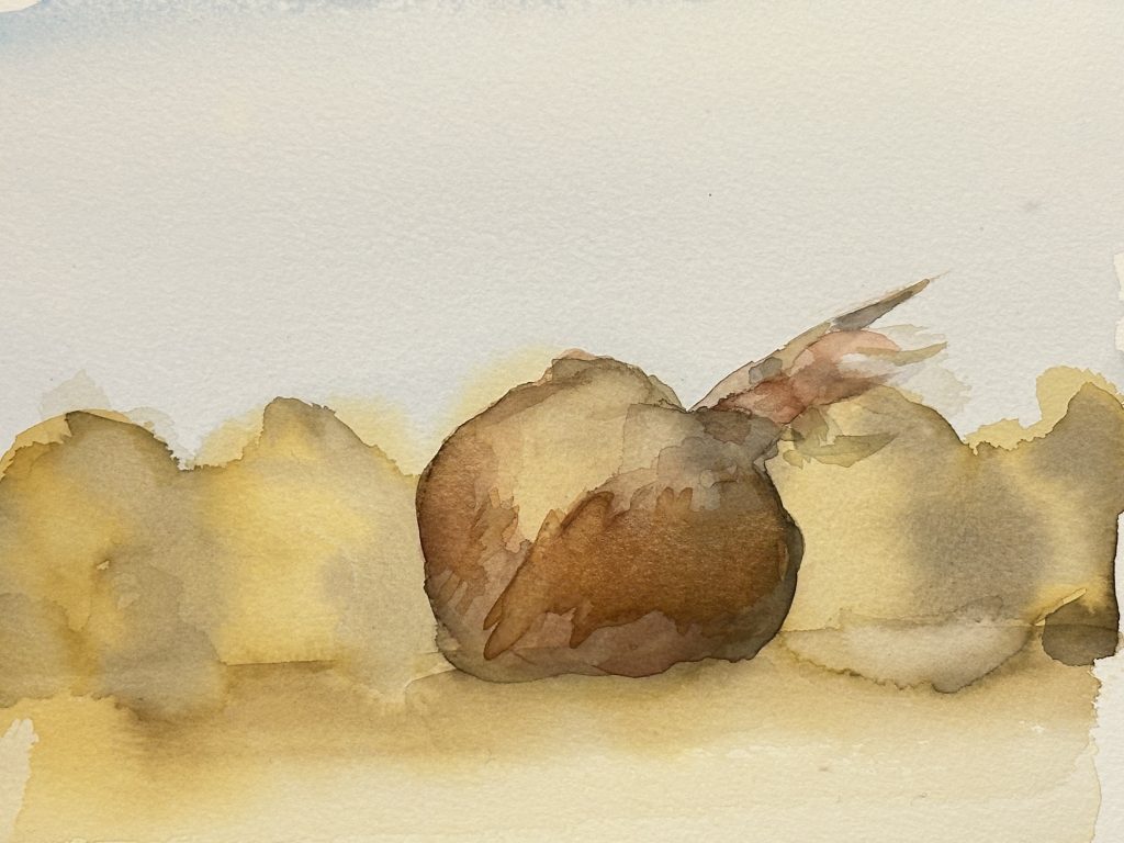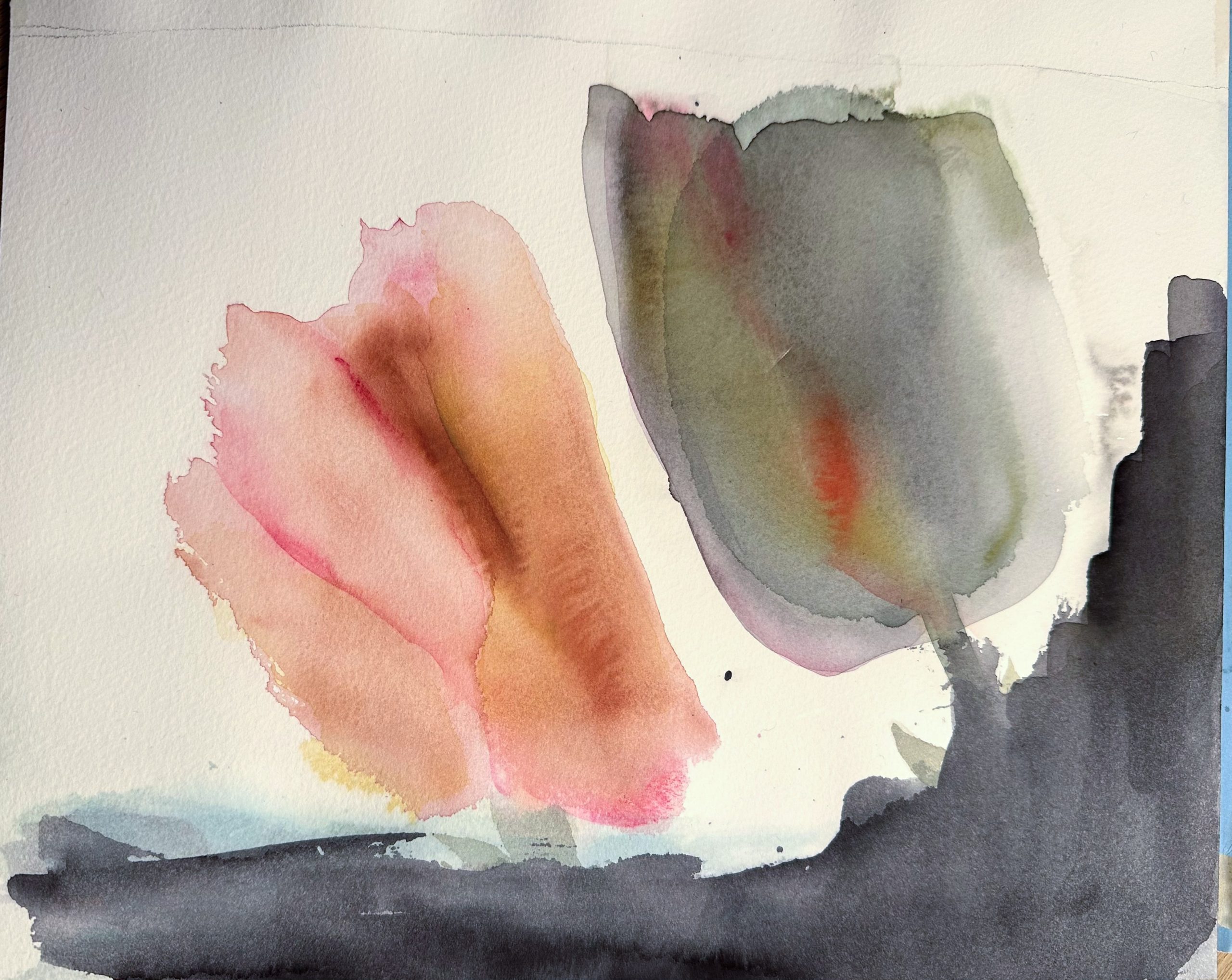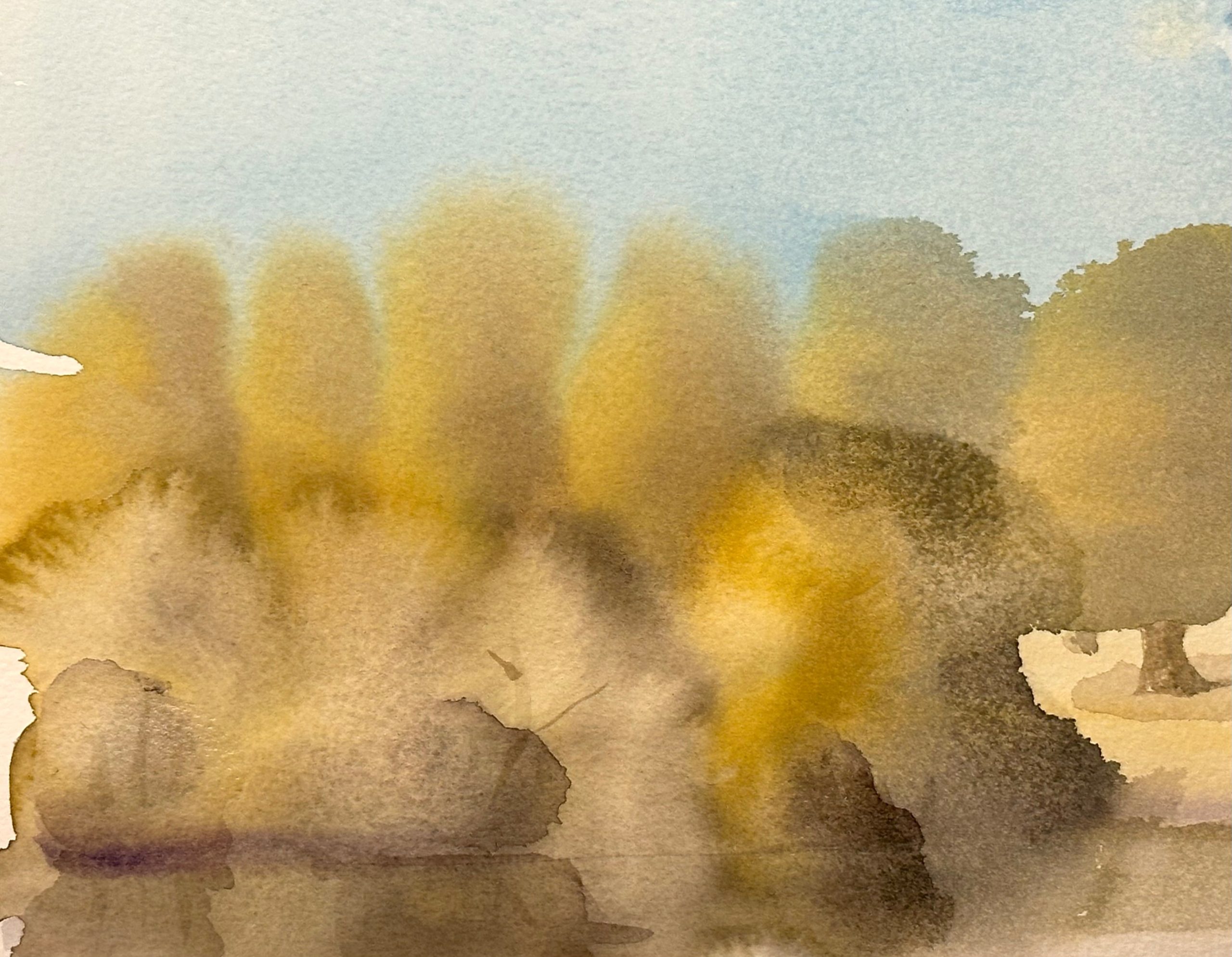 Har innrettet et lite «studio» på enden av kjøkkenbordet, sånn er det når man downsizer kraftig, og hvor jeg kan boltre meg med akvarellmaling og godt papir. Det dårlige papiret ble raskt identifisert, og forkastet. Har lært om liming, den vi andre går opp i.