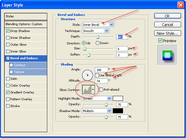 På neste side skal vi se på innstillingene for Gloss Contour, som er sirklet inn i illustrasjonen til venstre.