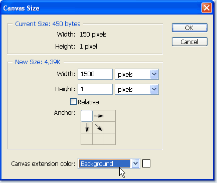 Canvas sizeFor at dette bildet skal bli den bakgrunnsfilen vi vil lage, skal vi legge til mange bildepunkter til høyre for det vi allerede har i bildet. Vanskelig sagt ... I Photoshop finnes det 2 funksjoner som gjør noe med bildets fysiske størrelse (da snakker jeg ikke om hjelpemiddelet Zoom, som forstørrer bildet visuelt mens vi arbeider med det.) Den ene er Image Size, som endrer hele bildets størrelse. Den andre er Canvas Size, som legger til pixler i bakgrunnsfargen, uten å endre bildets innhold. Det er denne vi skal benytte nå. Velg menyen Image > Canvas Size... Bildet til venstre er fra Photoshop CS. Fyll inn Width: 1500 pixels. Velg bakgrunnsfarge hvit i versjon CS, slik du ser av illustrasjonen. I tidligere versjoner må du velge bakgrunnsfarge før du øker Canvas Size! Versjon 1 av bakgrunnsfilen er nå ferdig. Du kan lagre den for web, File > Save for web..., lagre den som GIF, adaptive er et valg jeg pleier å benytte. Det er bare to farger i filen, så den får ikke noe "vekt" (i kb) å snakke om. Vil du lese mer om dette, kan du se om filformater og komprimering under definisjoner.